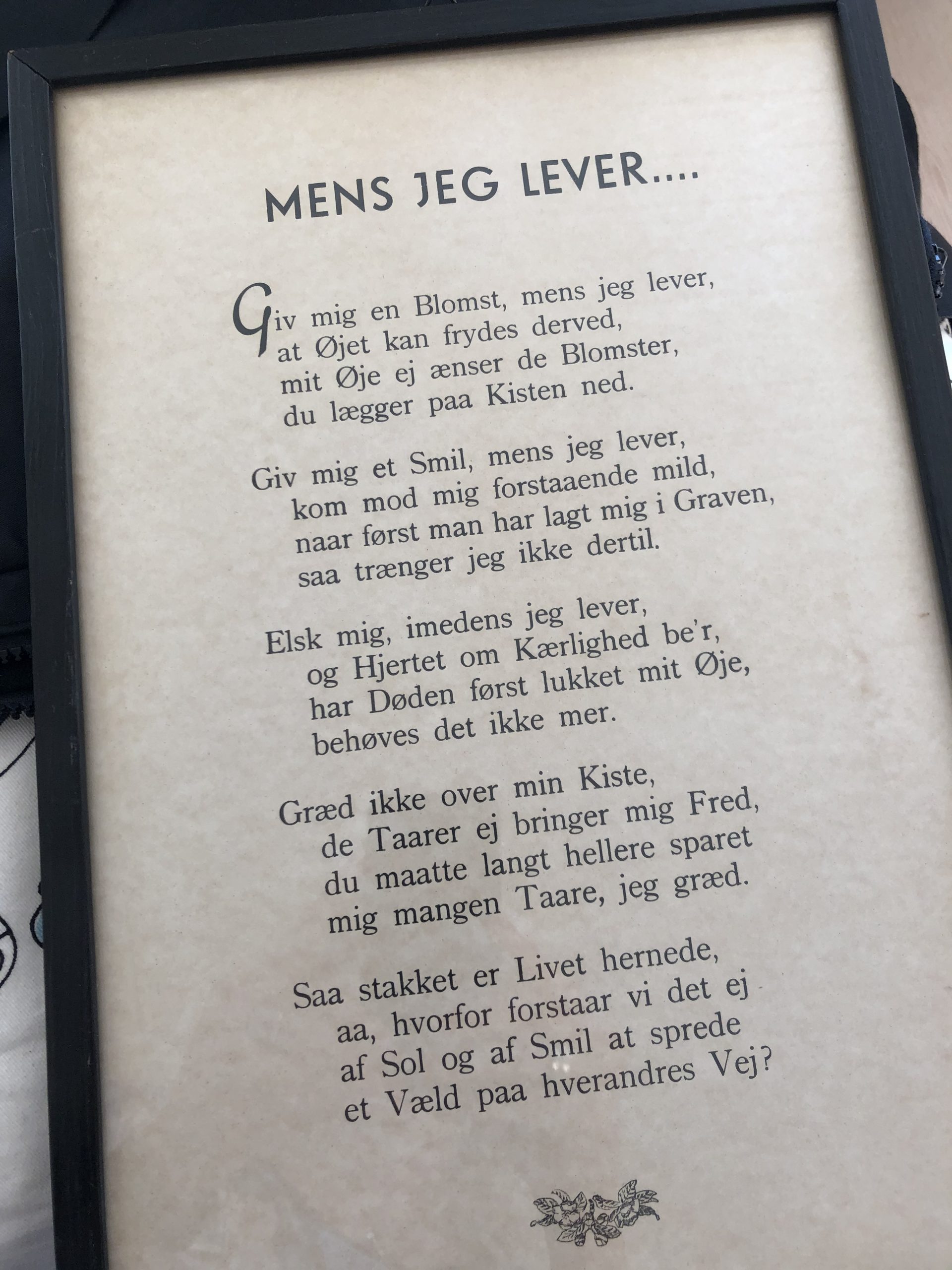 På min reol står indrammet et gammelt digt, som jeg har arvet fra min elskede farmor. ”Giv mig en Blomst, mens jeg lever, at Øjet kan frydes derved, – mit Øje ej ænser de Blomster, du lægger paa Kisten ned.” Og siger det ikke det hele, – vi skal være opmærksomme og taknemmelige over alle de dejlige ting og mennesker, som livet indeholder.